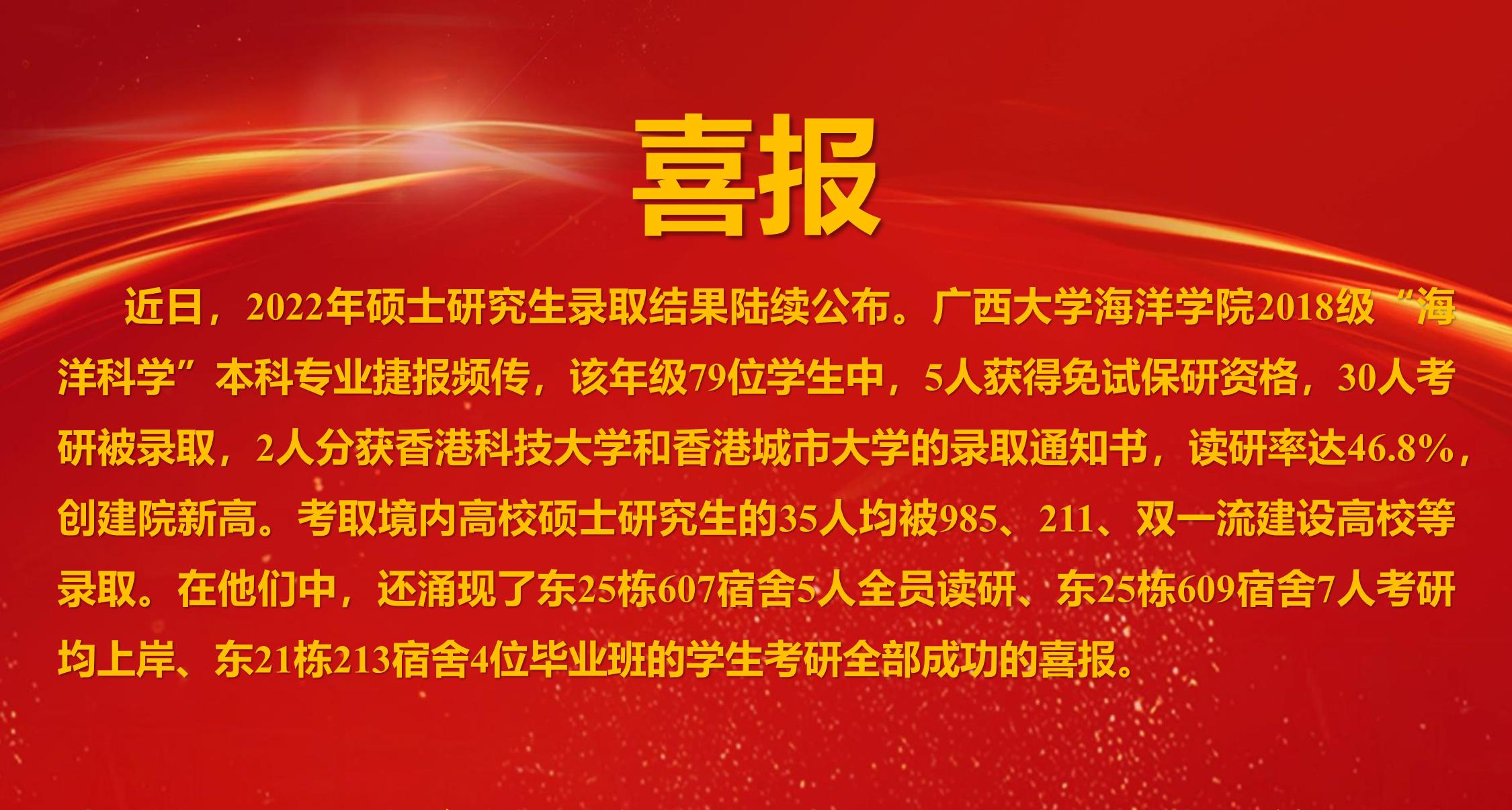 近日,2022年硕士研究生录取结果陆续公布。bevictor伟德官网2018级“海洋科学”本科专业捷报频传,该年级79位员工中,5人获得免试保研资格,30人考研被录取,2人分获香港科技大学和香港城市大学的录取通知书,读研率达46.8%,创建院新高。考取境内高校硕士研究生的35人均被985、211、“双一流”建设高校等录取。在他们中,还涌现了东25栋607宿舍5人全员读研、东25栋609宿舍7人考研均上岸、东21栋213宿舍4位毕业班的员工考研全部成功的喜报。