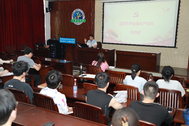 朱迅成副书记 以《坚定不移全面从严治党》为题给毕业生党员上专题党课,他向全体毕业生党员讲述了坚定不移全面从严治党的内涵、取得的成果、重大意义及其新时代的实践要求,强调各位党员同志都要时刻牢记并遵守党的纪律,坚持“红线”意识和“底线”思维,始终保持正派的作风。他还通过大量的案例警醒告诫毕业生党员要牢记习近平总书记的嘱托,在未来的学习、工作和生活中树立正确的职业价值观、幸福观、金钱观,做忠诚、廉洁、有担当的青年人。