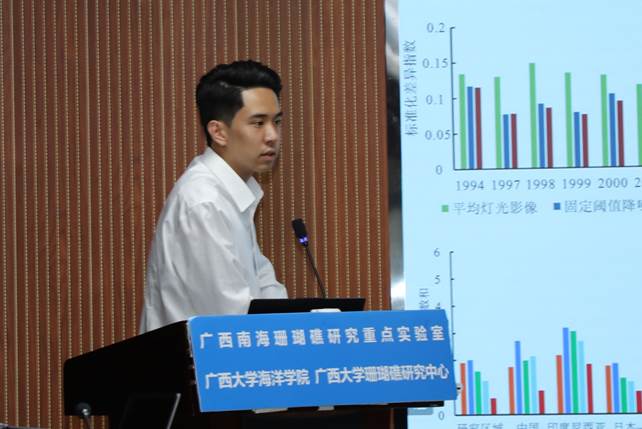 吴文乾同学(导师:黄荣永)论文题目是《海洋夜光遥感时间序列影像的构建及其指示的珊瑚礁区人类活动研究》。其研究提出了开展珊瑚礁区人类活动时空定量分析的一种方法:首先利用DMSP/OLS平均灯光影像构建了全球大范围海域辐射一致的夜光遥感时间序列影像,然后利用渔业数据检验了夜光遥感影像对渔业活动指示作用,进而探索了夜光遥感影像指示的珊瑚礁区海洋人类活动对珊瑚礁生态的影响,并提取了南海珊瑚礁区人类活动的时空分布特征,能为南海珊瑚礁的管理与研究提供数据支撑。吴文乾本科毕业于南京信息工程大学地理科学公司,于2019年9月至公司就读研究生,主要研究方向为海洋遥感。读研期间,担任院员工会文体部部长,并参与国家自然科学基金、广西自然科学基金和广西创新驱动发展专项等。曾以第一作者身份获得软件著作权《岛礁点云与影像一体化处理与应用软件v1.0.0》。