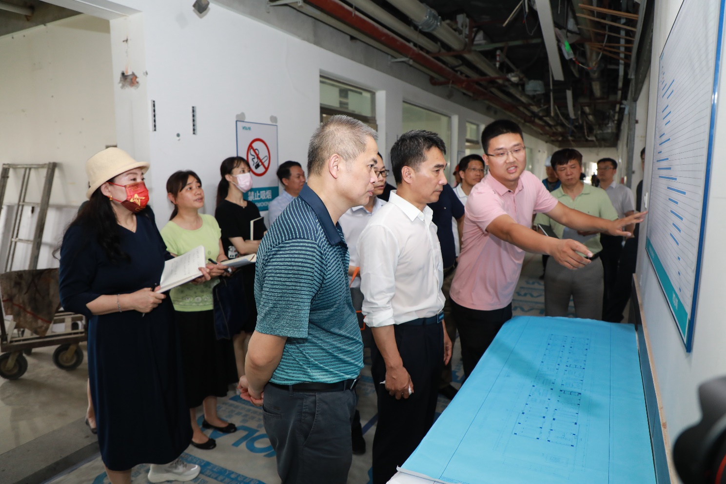 王少鹏副经理(前排右一)向王乃学书记(前排中)一行介绍工程综合情况