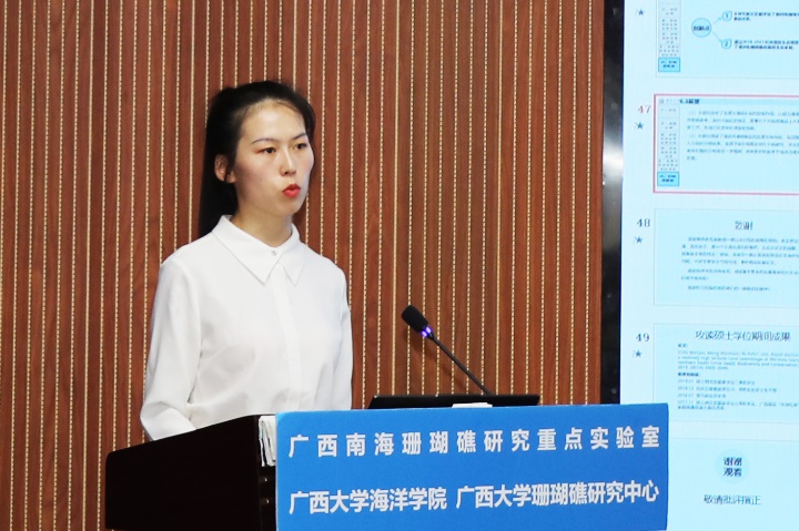 梁燕婷同学(导师:余克服教授)主要对黄岩岛珊瑚的共附生微生物进行了相关研究,其论文题目是《黄岩岛珊瑚共附生微生物的群落特征及其生态意义》。读研期间参与了西沙航次的采样工作、同时也参与了国家自然科学基金重大项目课题、国家自然科学基金重点项目、广西科技创新和基地人才专项项目等课题的研究,并以第一作者在国际期刊Marine Pollution Bulletin 上发表SCI论文:《Intergeneric and geomorphological variations in Symbiodiniaceae densities of reef-building corals in an isolated atoll, central South China Sea》。