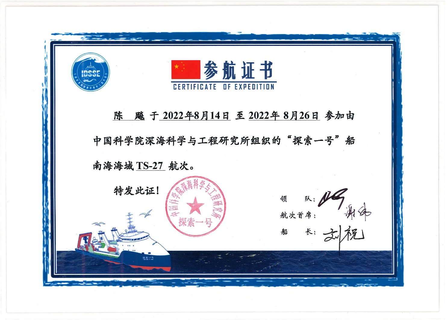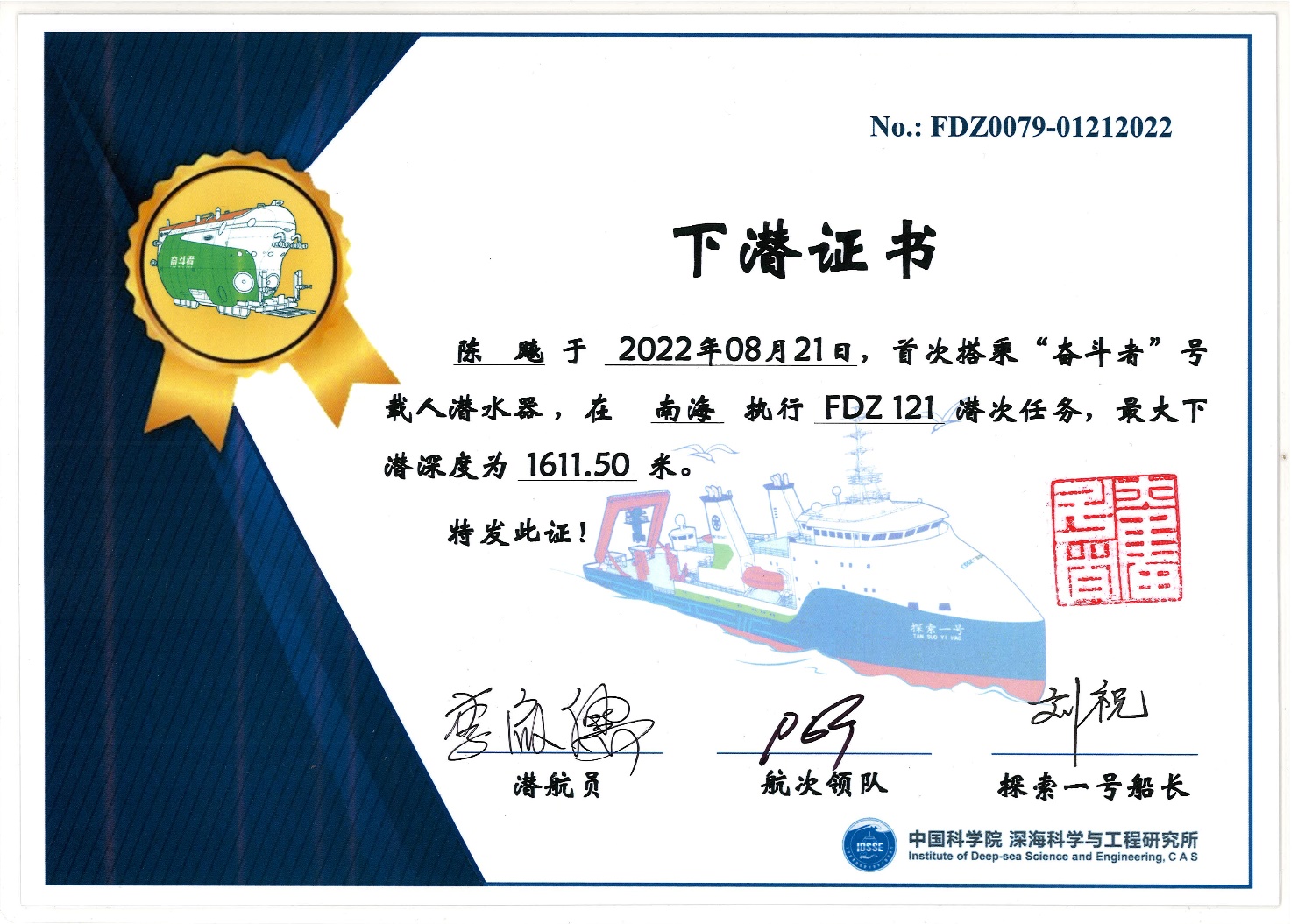2022年8月14日—27日,公司教师陈飚参与南方海洋科学与工程广东省实验室(珠海)的科研项目,赴南海中南海山区执行“南海海洋生物调查及深潜综合航次”第二航段的综合科学考察任务(编号TS-27)。本航次使用“探索一号”综合科考船和“奋斗者”号载人深潜器作为科考装备,并围绕关键科学问题“典型海山生态系统的关键过程及驱动机制”开展研究工作。去年12月,公司bevictor伟德官网教师曾乘“深海勇士”号下潜到了南海4195米的水深考察,其中陈飚老师的下潜水深为2471.6 m。
