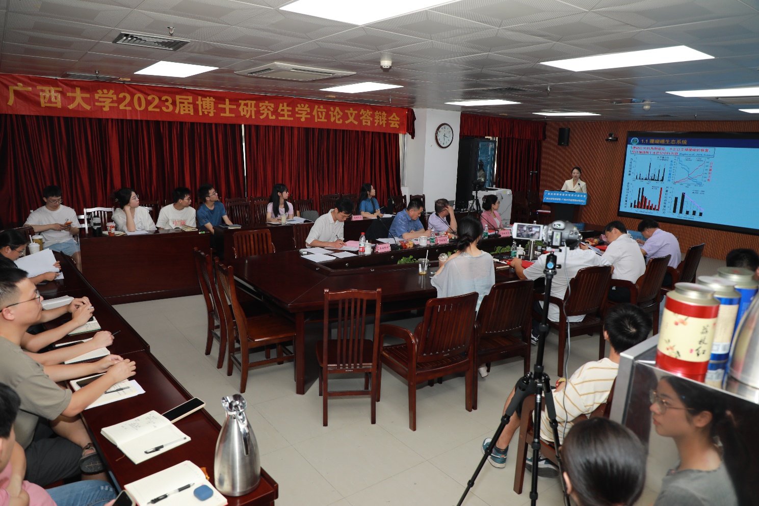 参加答辩的博士研究生与答辩主席、答辩委员、部分在读研究生们合影留念