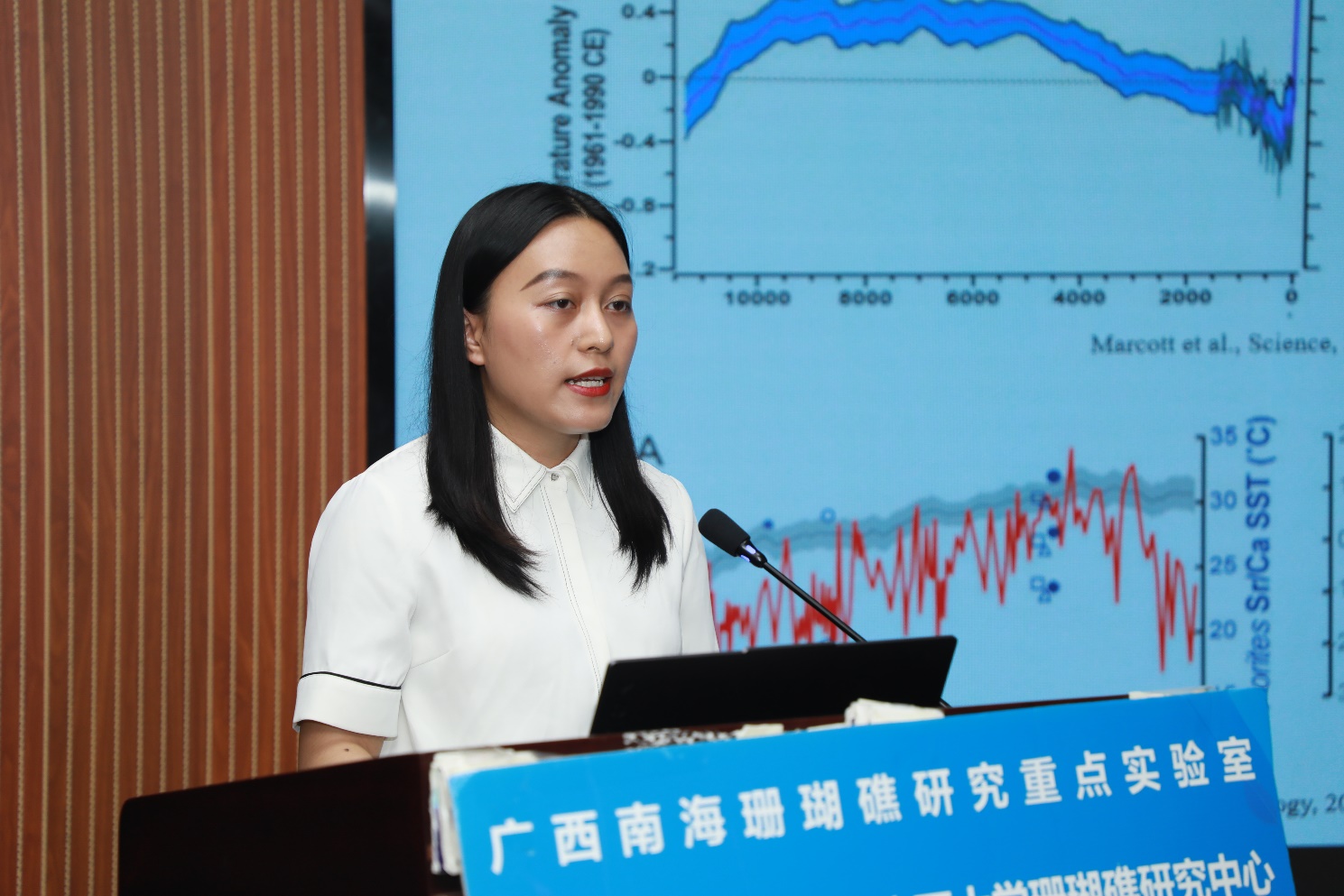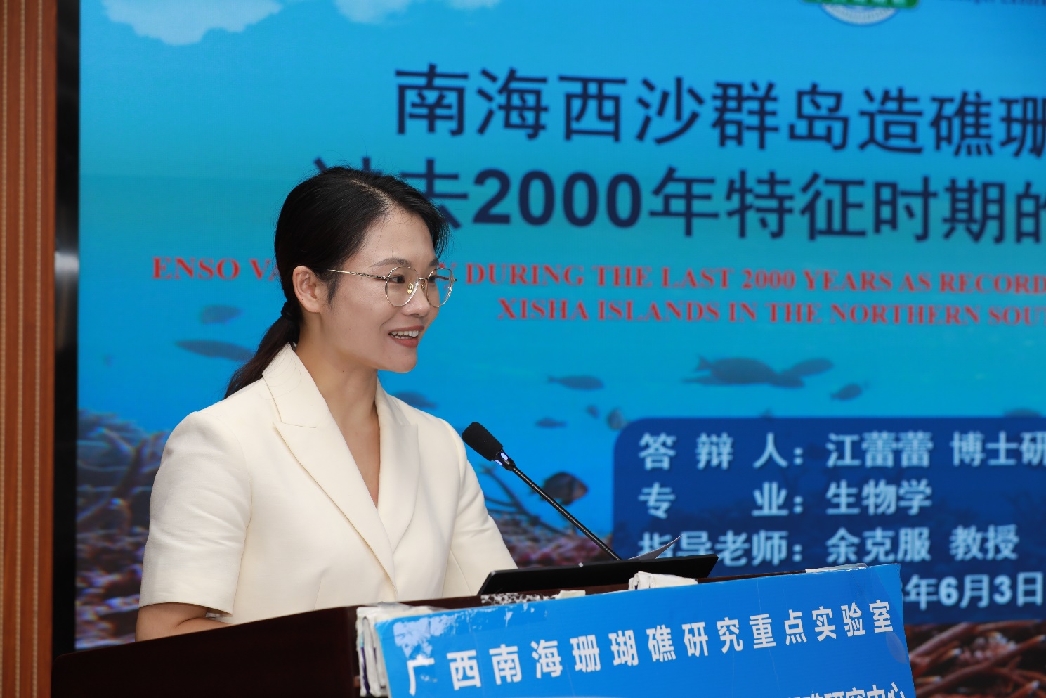 按照议程,两位博士分别汇报了学位论文:王浩《中 - 晚全新世南海北部珊瑚周期性白化与恢复的地球化学证据》、江蕾蕾《南海西沙群岛造礁珊瑚记录之过去2000年特征时期的ENSO活动》。2名博士从研究背景与意义、研究目的与意义、研究方法和科学依据等进行讲解,展示了自己在硕博连读期间开展的研究工作及所获得的研究成果。