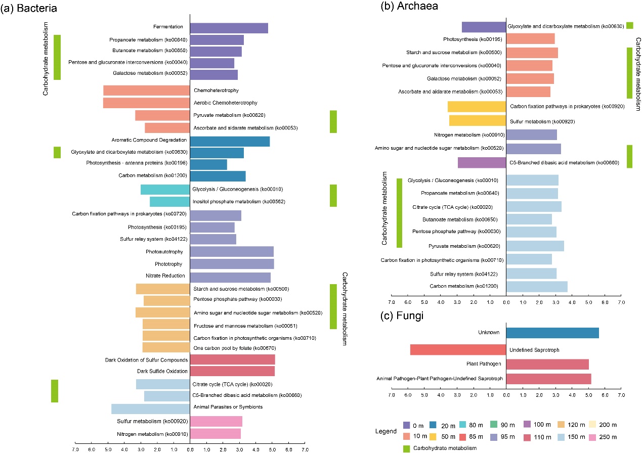 (5)细菌与古菌主要参与了三沙永乐龙洞水体中的碳循环、氮循环以及硫循环过程,而腐生营养型真菌则在微生物碳代谢中起到重要作用。1)碳循环。三沙永乐龙洞富氧层与深水厌氧层的碳循环主要由细菌与古菌共同驱动,而腐生营养型真菌与细菌则主导了化变层的碳代谢过程。2)氮循环。细菌与古菌共同参与了三沙永乐龙洞化变层的氮代谢过程,但深水厌氧层的氮代谢则主要由细菌驱动。3)硫循环。三沙永乐龙洞富氧层(化变层向上逸散)与深水厌氧层上边界的硫化物主要由古菌进行代谢,而化变层与深水厌氧层下边界的硫循环过程则主要由细菌驱动。上述结果指示了在三沙永乐龙洞水体中的4类微生物功能群具备差异的生态位和生物地球化学循环功能。