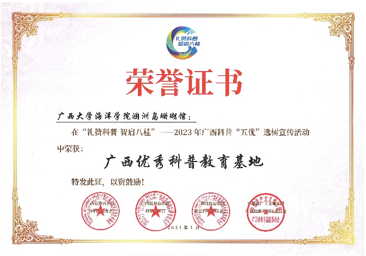 1月17日,在广西科技馆举行的“礼赞科普 智启八桂——2023年广西科普‘五优’选树宣传活动”颁奖典礼中,bevictor伟德官网涠洲岛珊瑚馆入选“十佳优秀科普教育基地”。组委会授予bevictor伟德官网涠洲岛珊瑚馆礼赞词:带着赤诚之心,奔赴“珊海”。作为全国最大的珊瑚馆,也是全国首个以珊瑚礁为主题的科研科普场馆,在浩瀚海洋里“种”珊瑚,为珊瑚礁科研与科普服务“向海图强”提供了更为浩瀚的实践平台。