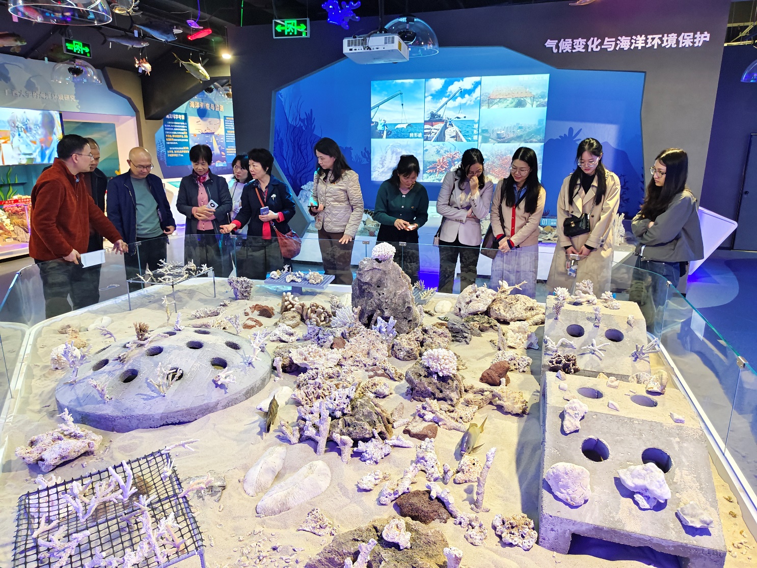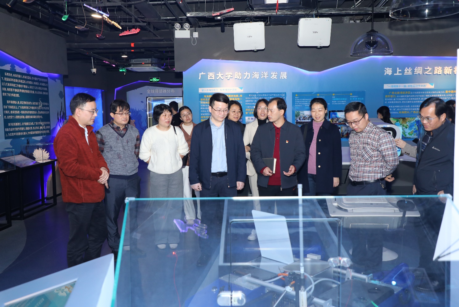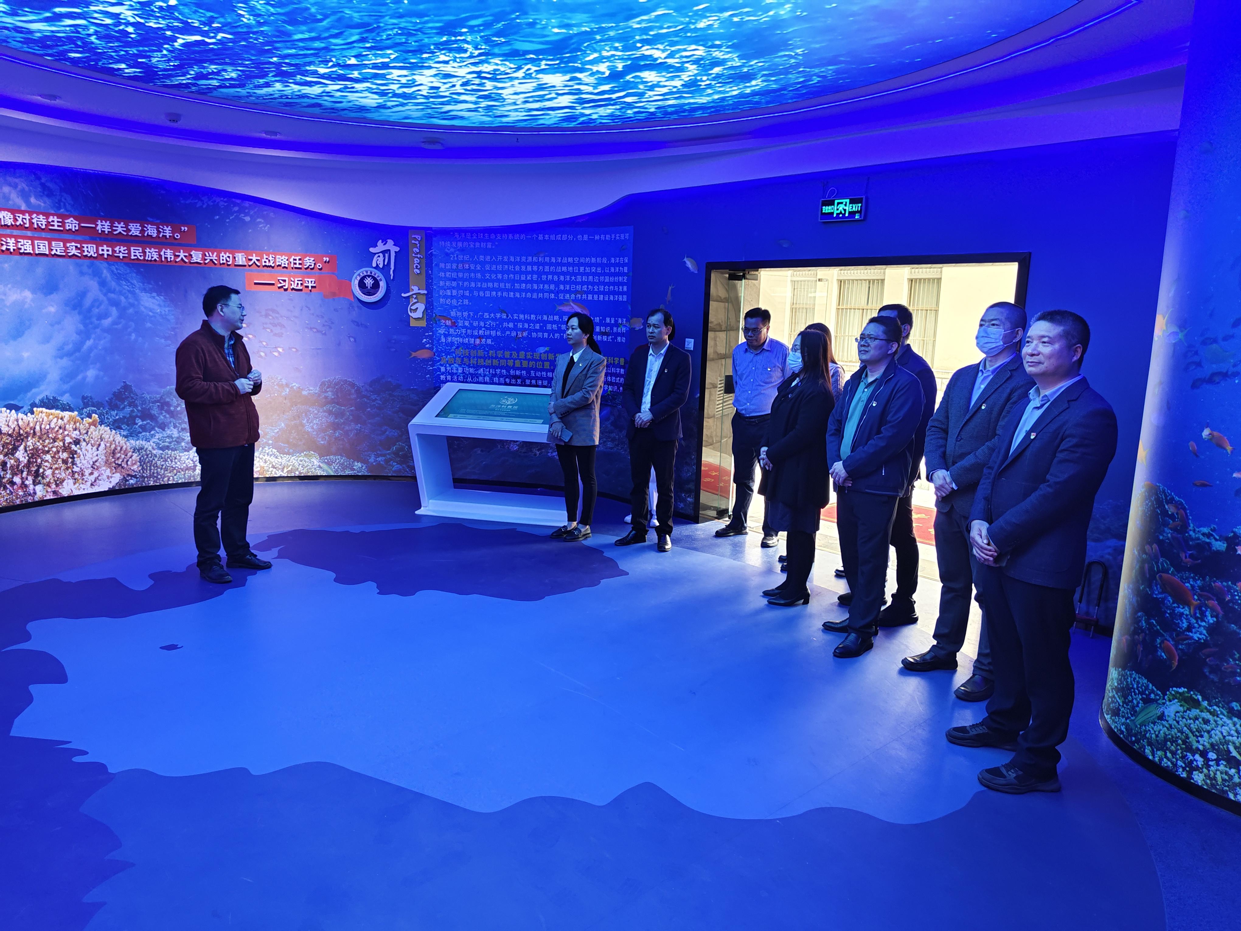 海洋科教馆常务副馆长李周佳、办公室主任周剑、实验中心副主任韦朝帅、组织员林玉华陪同调研。(李周佳/文 海洋科教馆、周剑/图 刘旗扬、周剑/编辑 秦华东/审核)