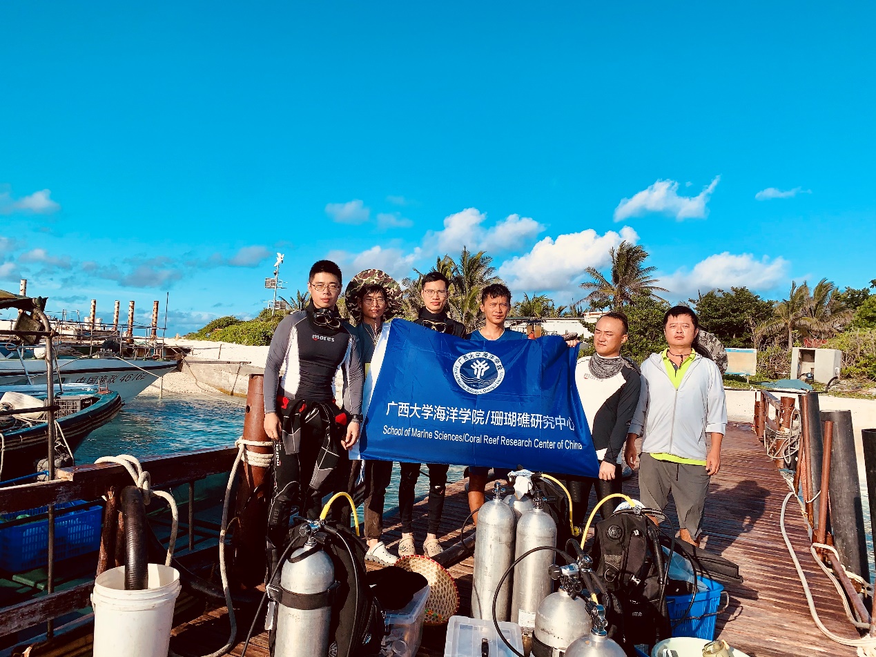 公司“蓝色梦想”科考队组织2023西沙群岛永乐环礁综合科学考察航次(左一:陈飚博士; 左二:夏荣林博士研究生;左三:覃祯俊博士)
