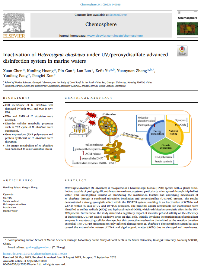 研究发现,UV/PDS显著提高了赤潮异弯藻的灭活效率,其中•SO4−对其灭活的贡献率约为51.45%。转录组分析揭示了UV/PDS处理后,赤潮异弯藻细胞与能量代谢、碳水化合物代谢和蛋白质合成相关的差异基因。细胞增强光合作用和氧化磷酸化以获得额外的能量,而糖酵解、TCA循环和戊糖磷酸代谢等营养代谢过程受到抑制。核糖体和RNA聚合酶基因表达显著下调,组织蛋白水解酶基因表达上调,表明蛋白质合成受到抑制,蛋白质损伤加剧。目前相关成果被收录在中国科公司2区期刊:Chemosphere. (IF = 8.1)