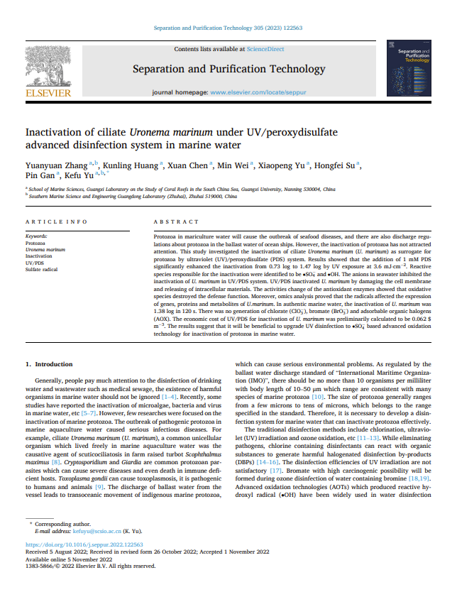 结果表明,UV/PDS系统对海洋尾丝虫具有极强的灭活效果,系统中产生的自由基破坏了海洋尾丝虫细胞的完整性和酶活性,且影响了基因、蛋白质的表达以及其代谢产物。研究还发现,添加碳源会抑制ClO3−,BrO3−等无机消毒副产物的产生。该技术为绿色高效海水养殖水体消毒技术的发展提供了新的思路。目前相关成果被收录在中国科公司1区期刊:Separation and Purification Technology. (IF = 8.1)
