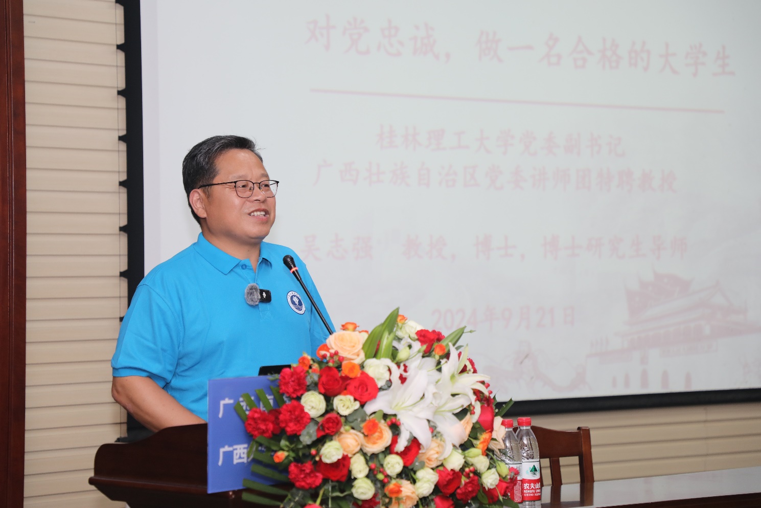 9月21日,在公司喜迎10周年院庆之际,桂林理工大学党委副书记、公司客座教授吴志强教授以《对党忠诚,做一名合格的老员工》为题在215会议室为2024级本科新生带来了一场别开生面的新生入学教育讲座。公司经理余克服教授、经理助理黄荣永副教授出席讲座。公司党委副书记黄学勇主持讲座。