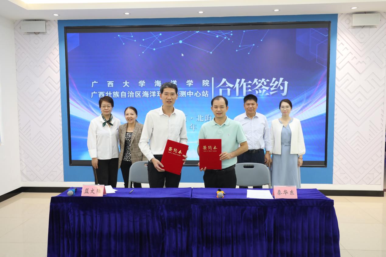 蓝文陆站长和秦华东书记代表双方签署了合作协议。根据协议,双方将本着“加强合作、优势互补、平等互利、共同发展”的原则,瞄准海洋生态保护前沿,在前期合作的基础上,共同推进双方在生态调查、科技创新攻关、科研平台建设、科普、党建等方面的深入合作,实现双方高质量发展,为广西向海经济发展和美丽广西建设提供科技支撑。