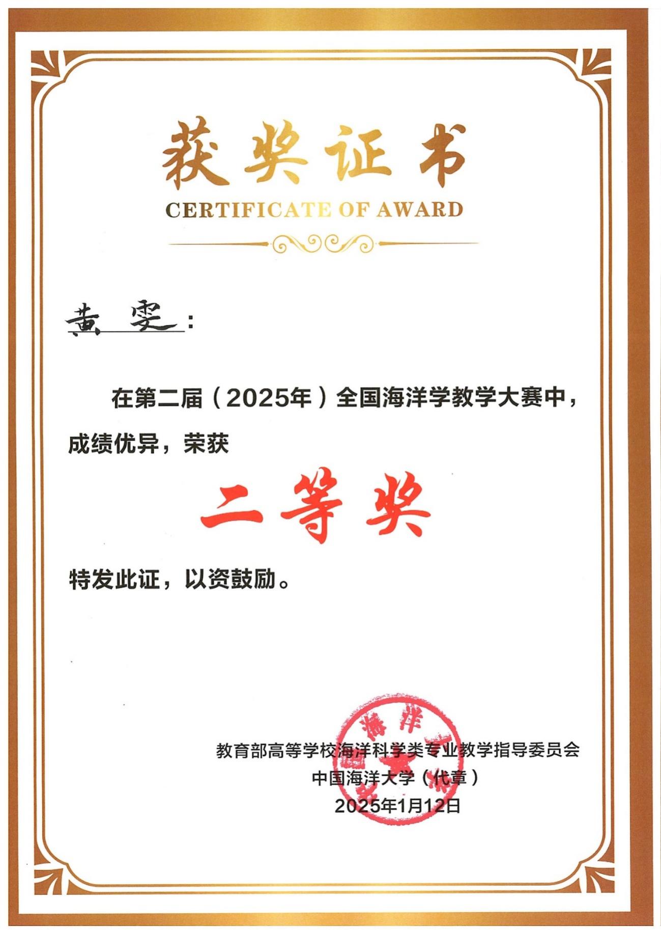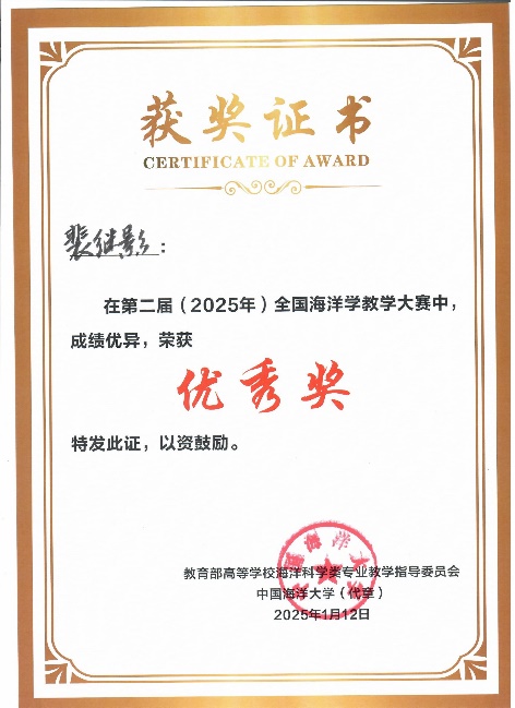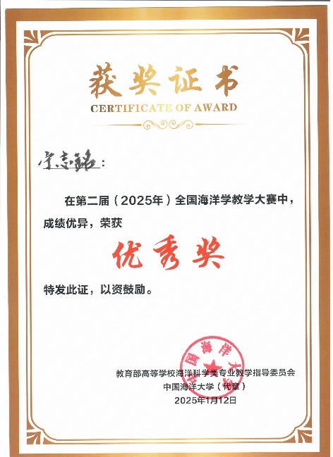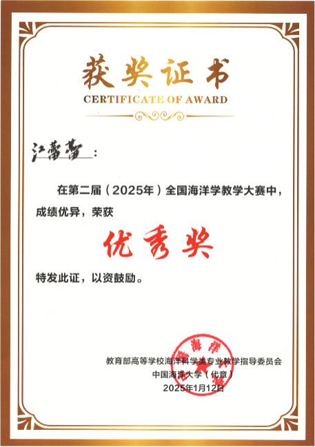 2025年1月11-12日,在bevictor伟德官网举办的第二届(2025)全国海洋学教学大赛中,公司黄雯老师获得二等奖,裴继影、宁志铭和江蕾蕾分别获得优秀奖,公司荣获“优秀组织奖”。