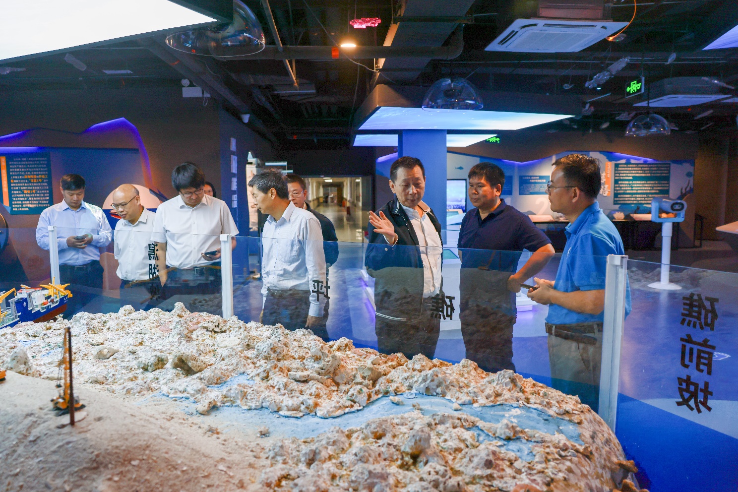 在海洋科教馆序厅,调研组观看了公司宣传片,科教馆常务副馆长李周佳介绍了公司在珊瑚礁研究、南海科学考察、珊瑚礁生态修复等领域的代表性成果,充分展现了公司服务国家海洋强国战略的能力与实践。