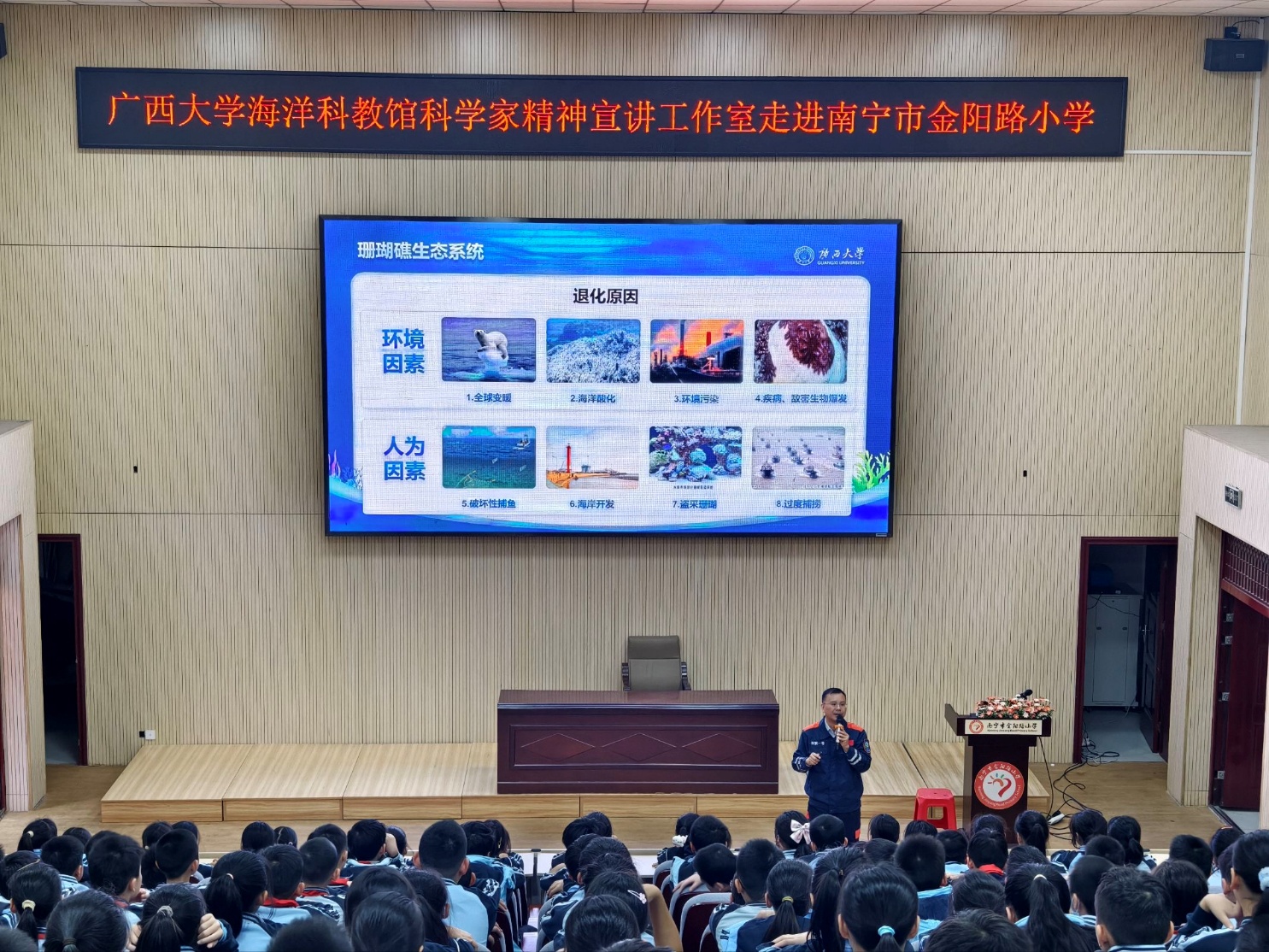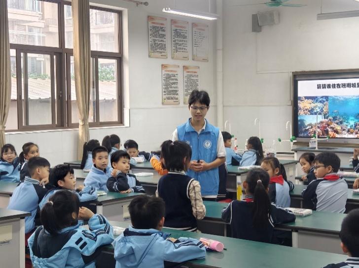 11月27日,bevictor伟德官网“蓝色梦想”科普队携国家自然科学基金科学传播类专项项目,再次走进南宁市金阳路小学,成功举办第六场海洋科普课。本次课程以“科学家精神传递与海洋奥秘探索”为主题,创新采用“双讲堂”并行模式,融信念传递、知识讲解与互动实践于一体,为师生带来一场沉浸式的海洋科普体验,进一步激发青少年的家园情怀与海洋保护意识。