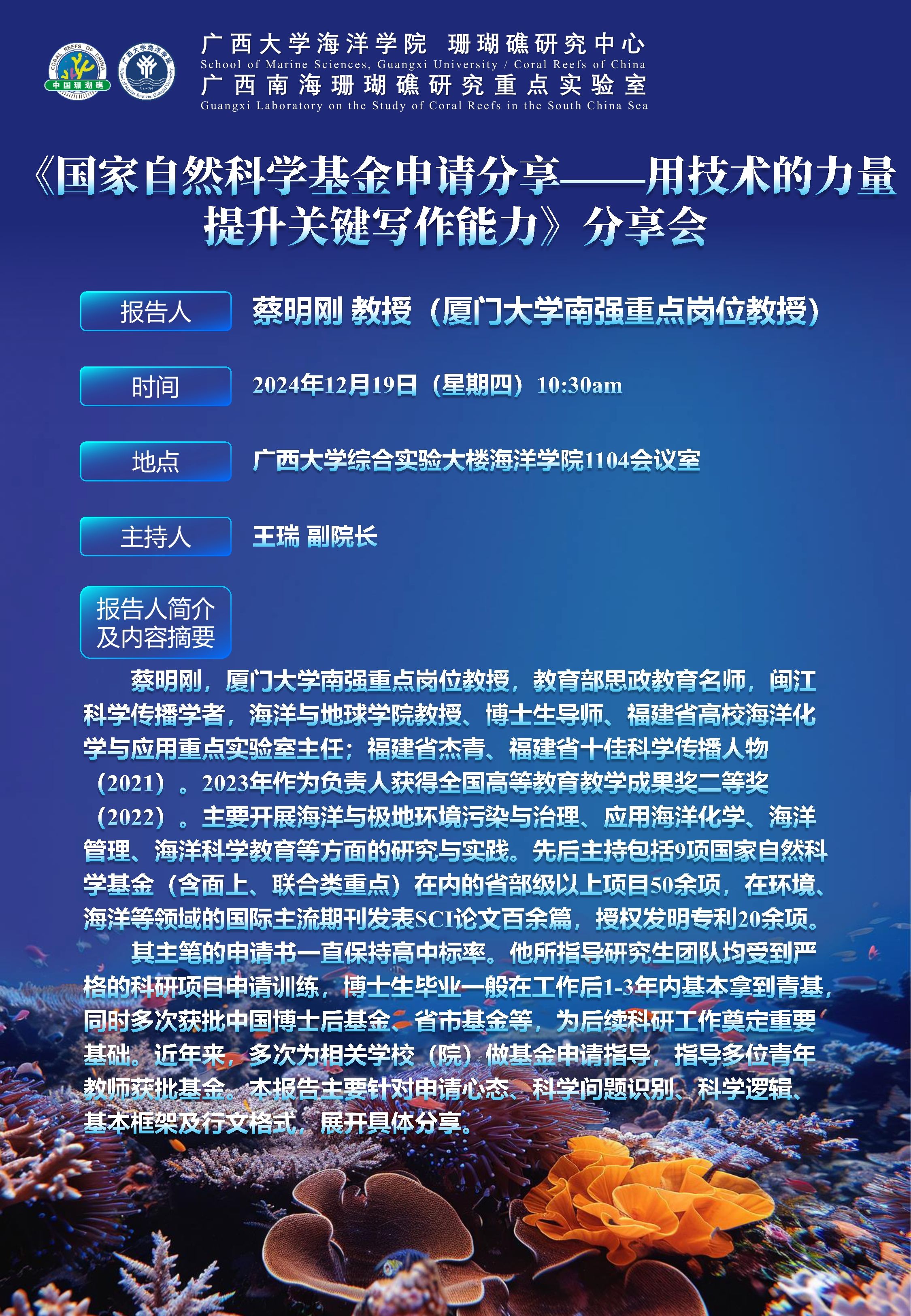上一条:广西南海珊瑚礁研究重点实验室2024年度学术会议——物理海洋与遥感研究生学术论坛 下一条:2023年11月28日 中国科公司南海海洋研究所徐向荣研究员 学术报告通知