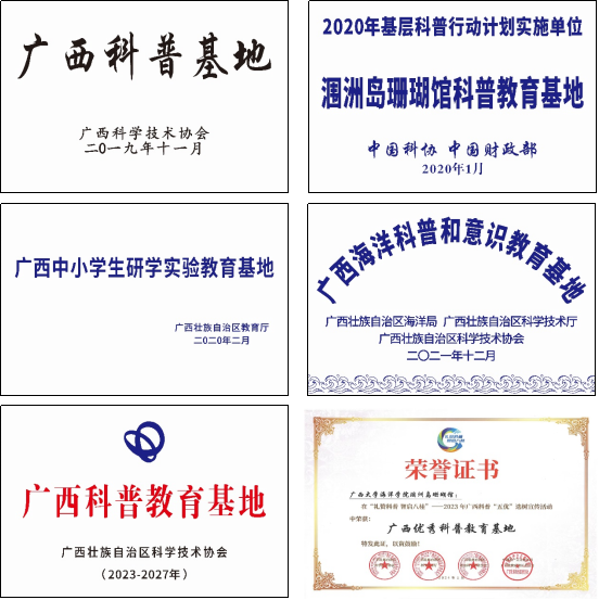 In 2021, Coral Hall was awarded the title of "Guangxi Marine Science Popularization and Awareness Education Base" jointly by the Autonomous Region Oceanic Bureau, the Department of Science and Technology, and the Science and Technology Association.